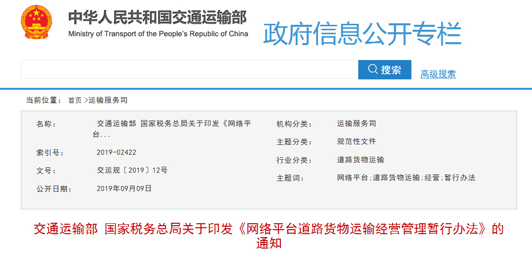 自2020年1月1日起将开始施行 《网络平台道路货物运输经营管理暂行办法》